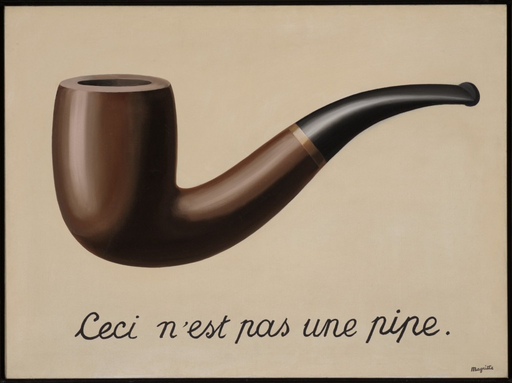 Lukisan Magritte The Treachery of Images menunjukkan sebuah pipa dengan tulisan This not a pipe’ di bawahnya. Sekilas ini tampak kontradiksi, tetapi sebenarnya itu betul: ini bukan pipa, itu adalah gambar pipa. Magritte menunjukkan bahwa lukisan adalah ilusi. Ia mencoba memahami bahasa seni lukis, bagaimana cara kerjanya dan bagaimana sebuah lukisan menyampaikan gagasan, dan menantang persepsi prakondisi pengamat tentang bentuk seni. Lukisan bunga bukan tentang bunga, ini tentang media lukisan: tradisi, sejarah, bingkai, galeri, dan harapan yang dimiliki pemirsa.