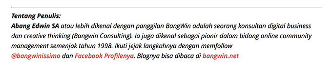 Saat ini kami hanya bisa membarter kontribusi Anda dengan eksposur berbentuk profil kontributor yang akan diletakkan pada setiap konten Anda jika dimuat, seperti contohnya dibawah ini:
